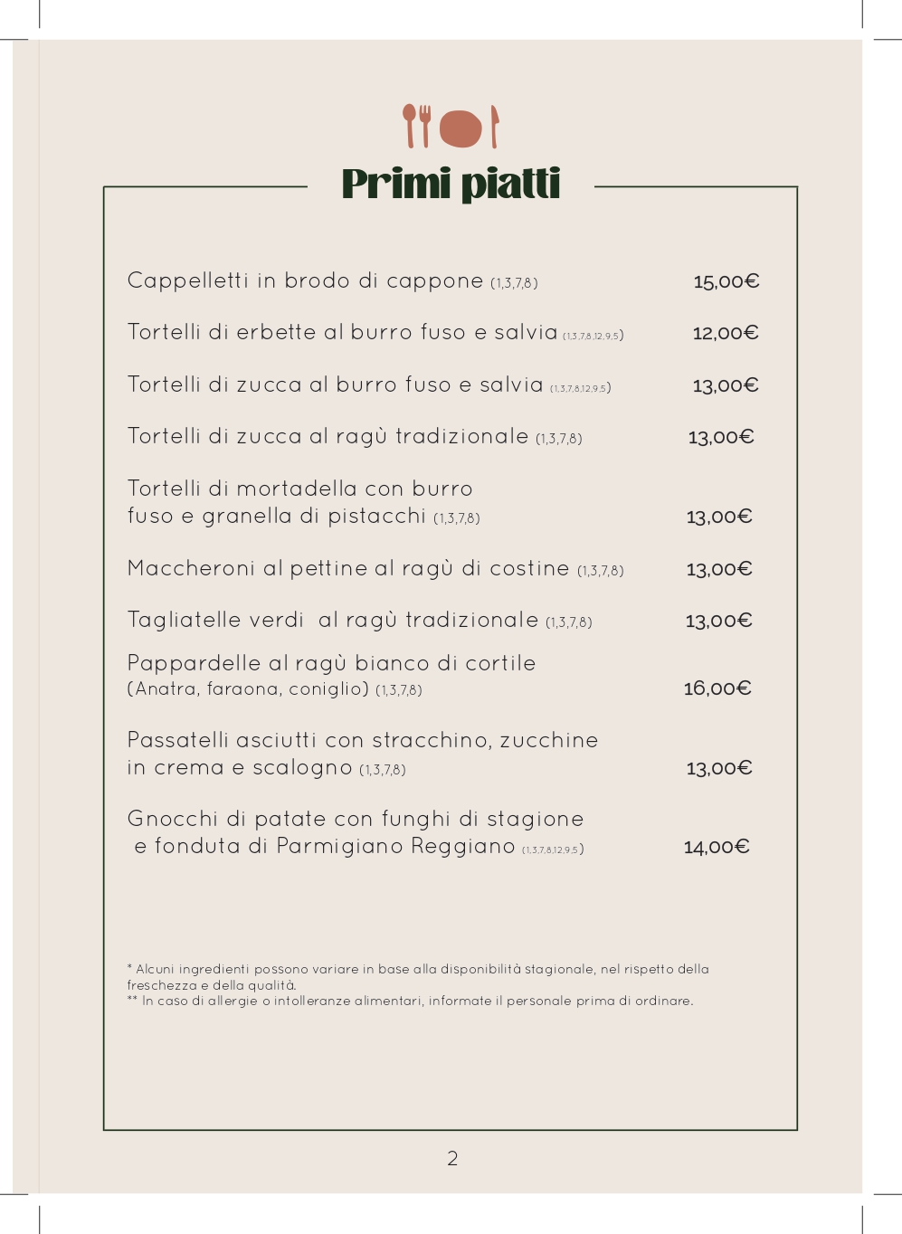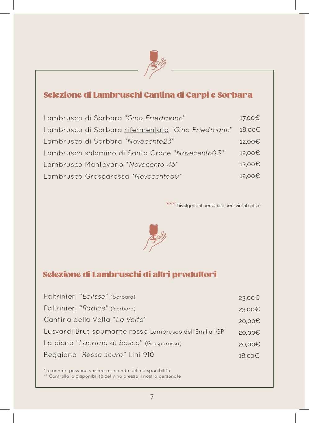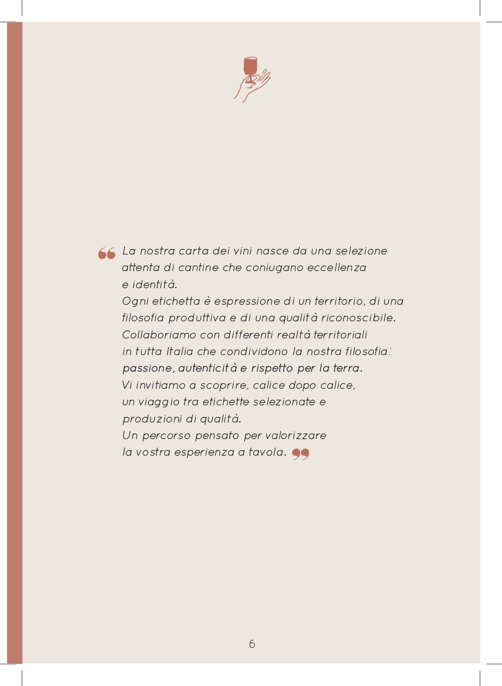 Le ricette ed i vini selezionati, vogliono offrire le tipicità emiliane fatte di materie prime del territorio di alta qualità a filiera corta o di produttori eccellenti, combinate con la nostra voglia di sperimentare, per proporre una cucina semplice, curata e con una nota di novità nella conservazione della tradizione.