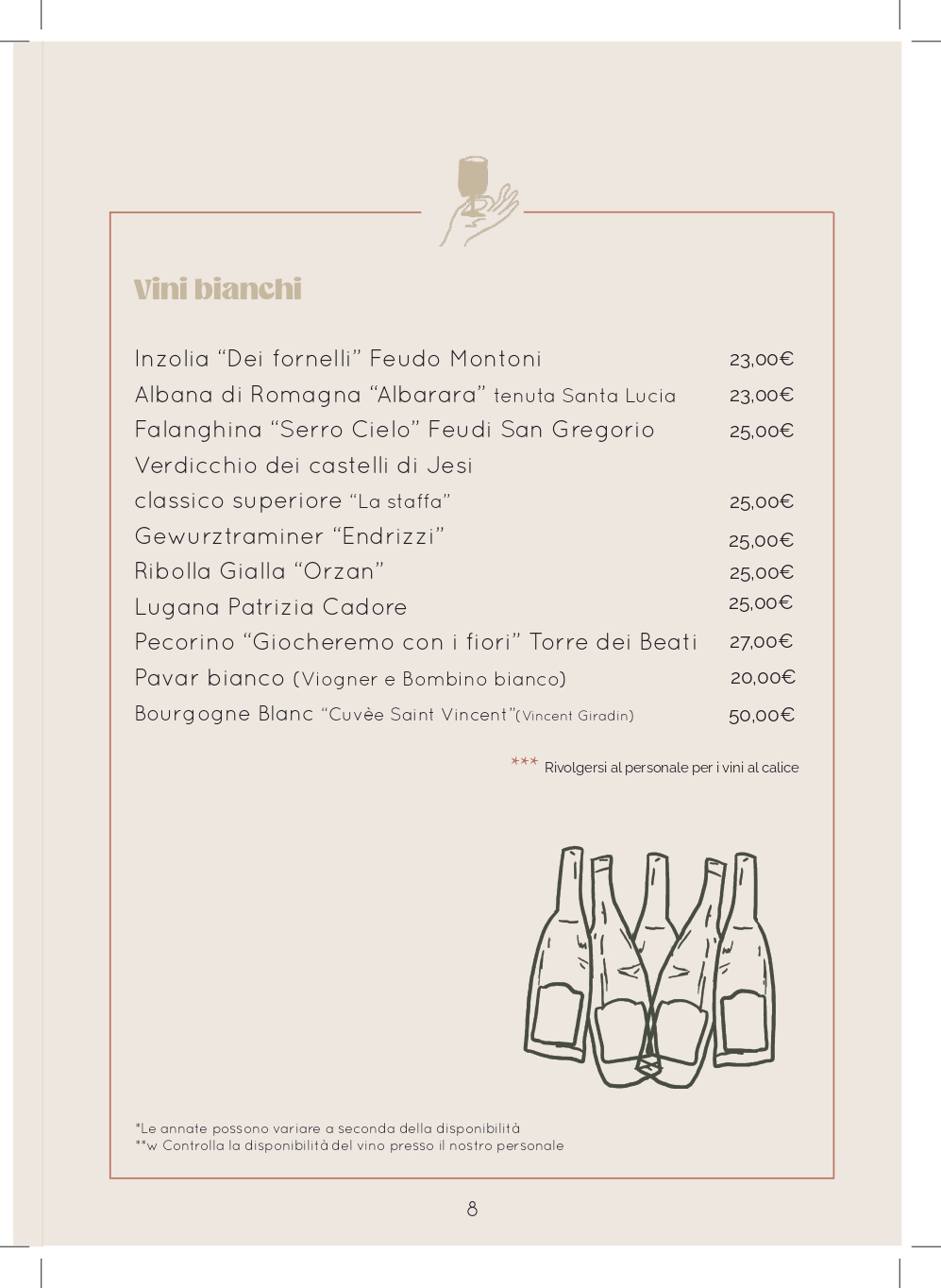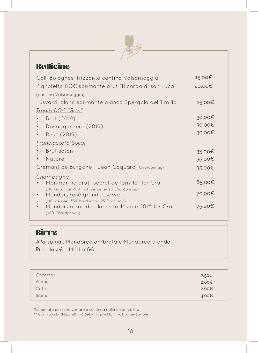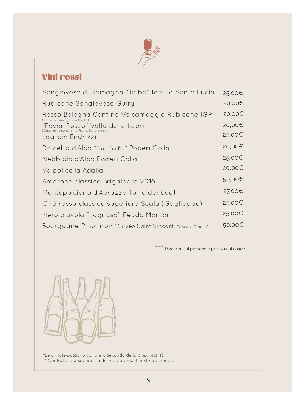 Le ricette ed i vini selezionati, vogliono offrire le tipicità emiliane fatte di materie prime del territorio di alta qualità a filiera corta o di produttori eccellenti, combinate con la nostra voglia di sperimentare, per proporre una cucina semplice, curata e con una nota di novità nella conservazione della tradizione.